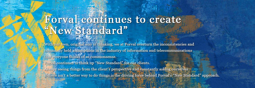 In 1980, the year that Forval Corporation was established, the information and telecommunications market was monopolized by a handful of companies. Looking back, it was a time of “no choice”, “sky-high charges” and “poor service”. Forval created “New Standard” business models, such as “letting you select your favorite type of telephone and the manufacturer” and “making telephone charges cheaper by plugging in a free adapter” as a way of breaking out of this situation. We create fresh “New Standard” business models, one after the other, that introduce the principle of competition to the information and telecommunications industry. We are proud to impart the notions of “improving service quality” and “reasonable prices” to this sector.